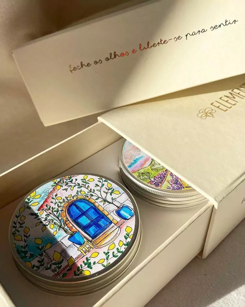 ~ A box acompanha 2 velas pocket • em lata (box original: vela lavanda e chá branco + limão siciliano - caso queira outra lata da linha pocket, solicitar nas observações antes de finalizar a compra)