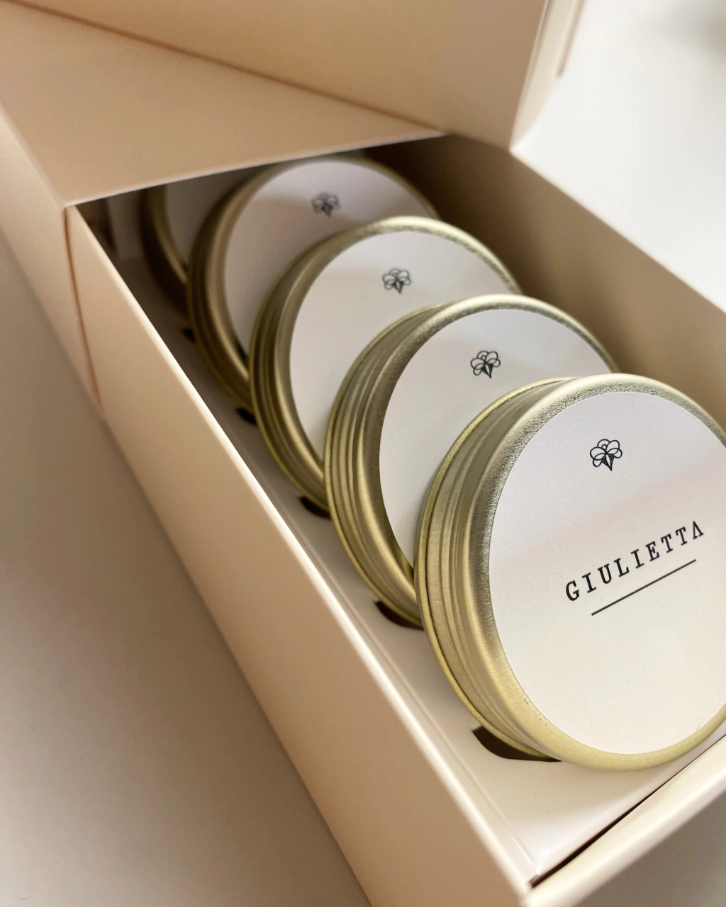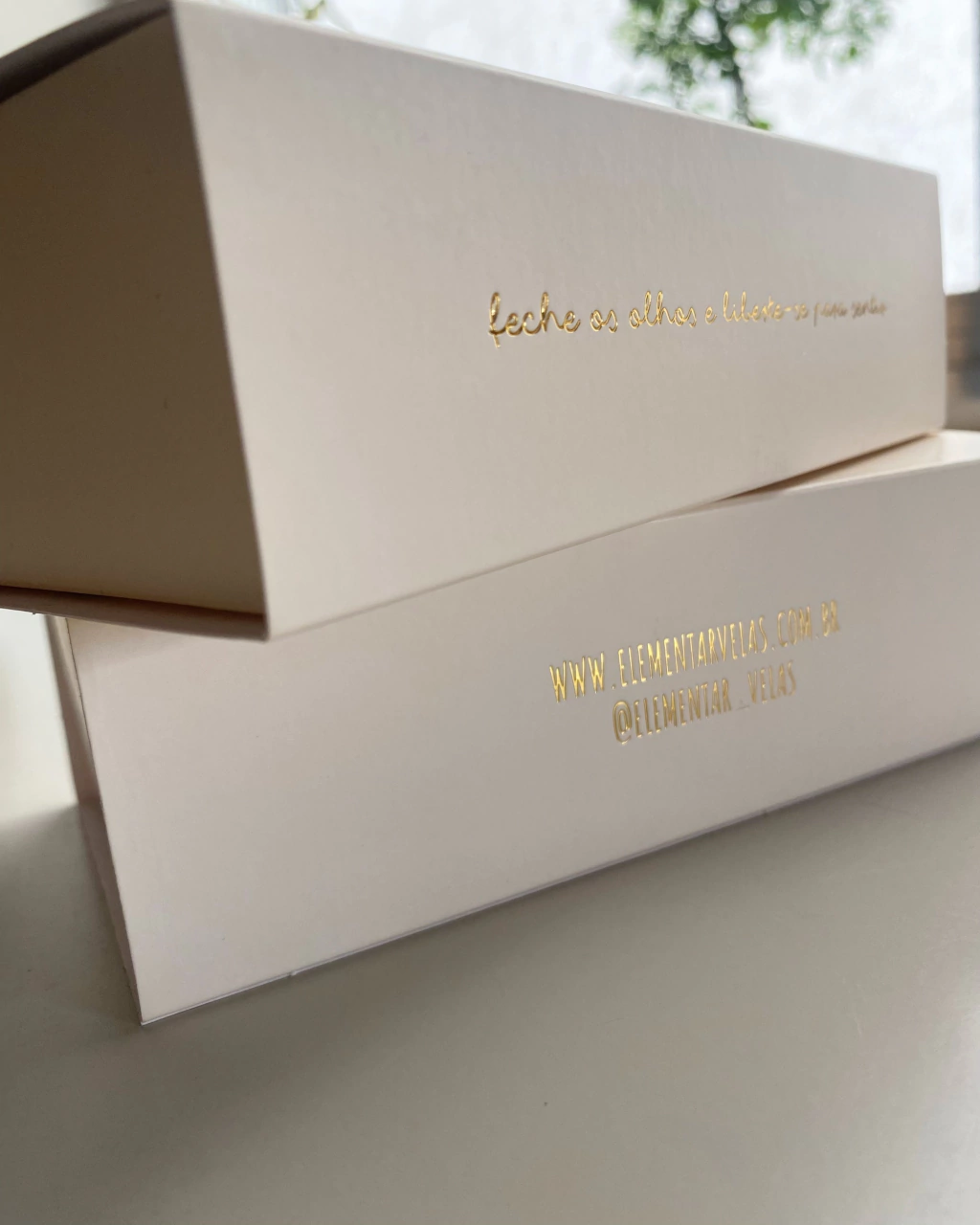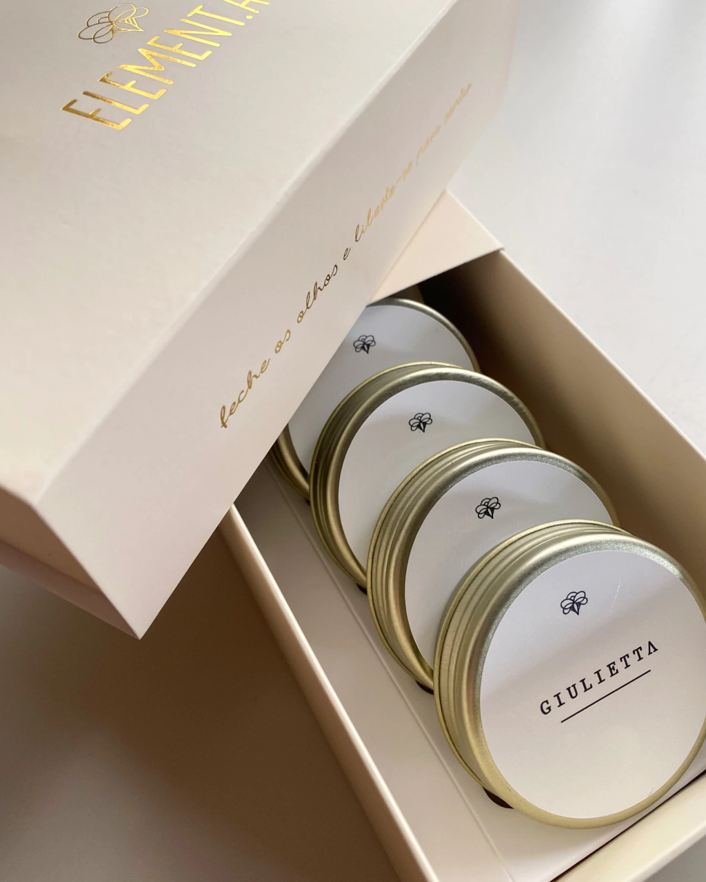 ~ A box acompanha 5 velas com os aromas mais vendidos na ELEMENTAR • em lata 30g